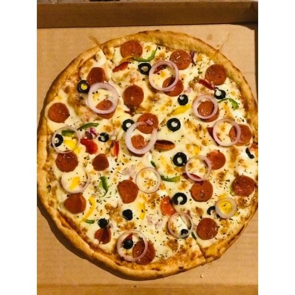 Mozzarella Cheese, Creem Cheese, Sausages, Onion, Olives and Bell Pepper