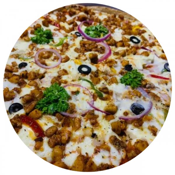 Mozerella Cheese, Creamy Cheese Sauce, Extra fried Chicken, Bell pepper, Onion rings, Olives