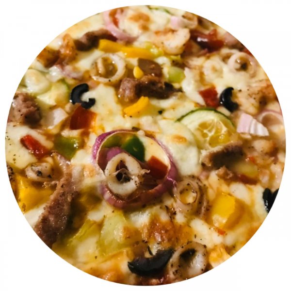 Mozzarella Cheese, Creamy Cheese Sauce, Fried prawns, Fried Cuttlefish, Fried Fish, Bell pepper, Onion rings, Olives