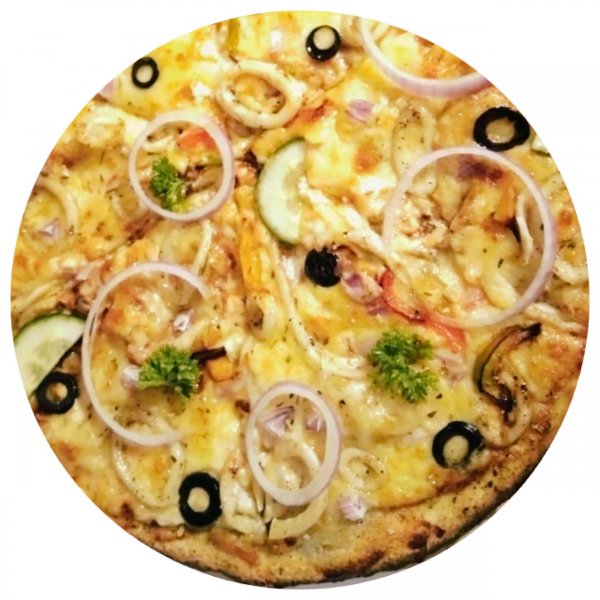 Mozzarella Cheese, Creamy Cheese Sauce, Fried cuttlefish, Bell pepper, Onion rings, Olives